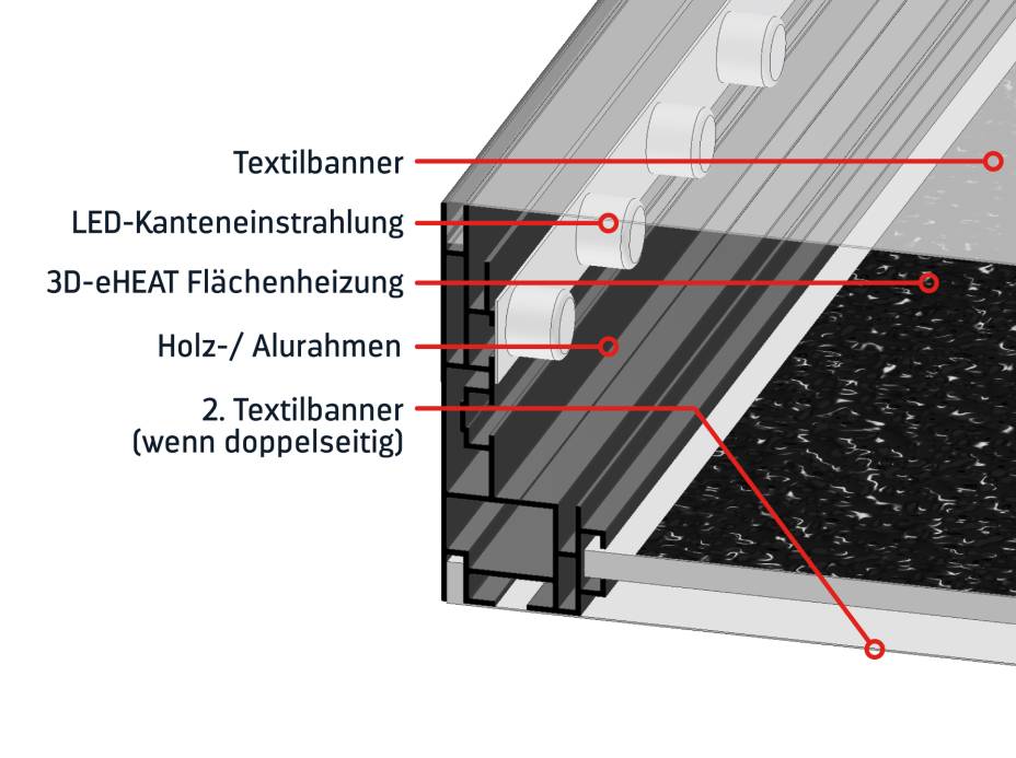 Der HEATFRAME von 3D-eHEAT vereint hochwertiges Interior-Design mit intelligenter Gebäudetechnologie. Der beleuchtete Spannrahmen mit austauschbarem Textildruckbanner integriert nahtlos dimmbare LED-Beleuchtung und unsere unsichtbare, wartungsfreie Heiztechnologie KOHPA®therm.